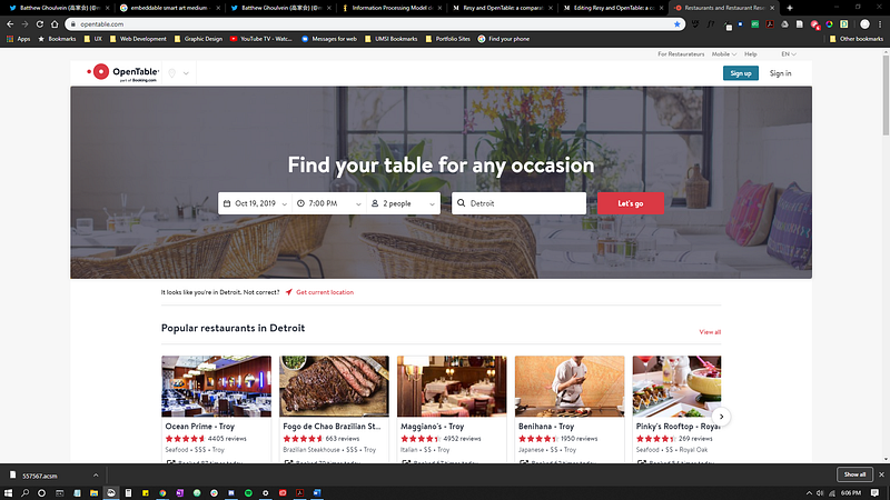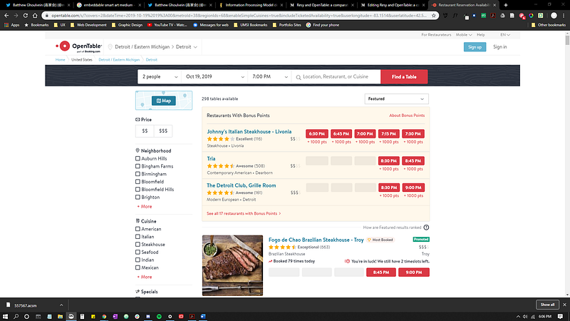 OpenTable takes advantage of the center-stage approach to interface design. It provides usability features for a broader range of users, presenting the map and list view as different modes that users can select. Overall, the OpenTable design is superior but has its own issues. Date, time, and guest selections are too spread out on the homepage and cause the user to lose track of some of the information they entered or missed entering as their eyes focus on the “Let’s Go” (Johnson, p. 56). We also see some dark UX in use as OpenTable makes a concerted effort to funnel users to promoted restaurants via “Bonus Points” (Brignall, 2019).