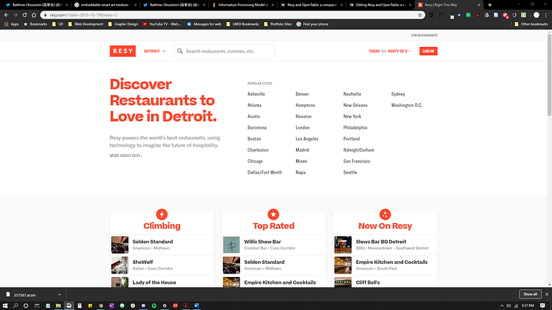 Resy is arranged to be viewed left to right and top to bottom, but it doesn’t lend itself well to a clear use as the user’s eyes scan over the menu of cities to select from, even though the website has already detected the user’s location. The elements involved in initiating the search and booking a reservation are less distinct from the rest of the page and blend in somewhat with the white space across the header (Lee et al., p. 109).