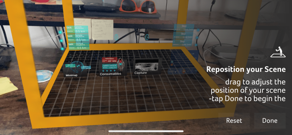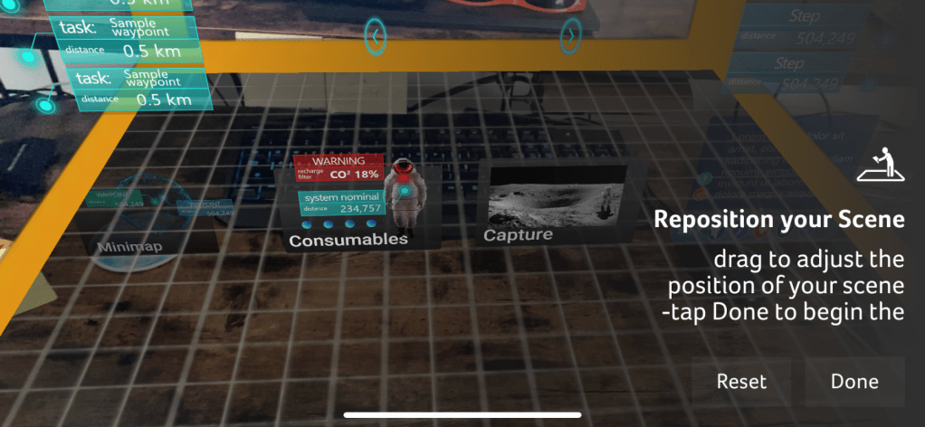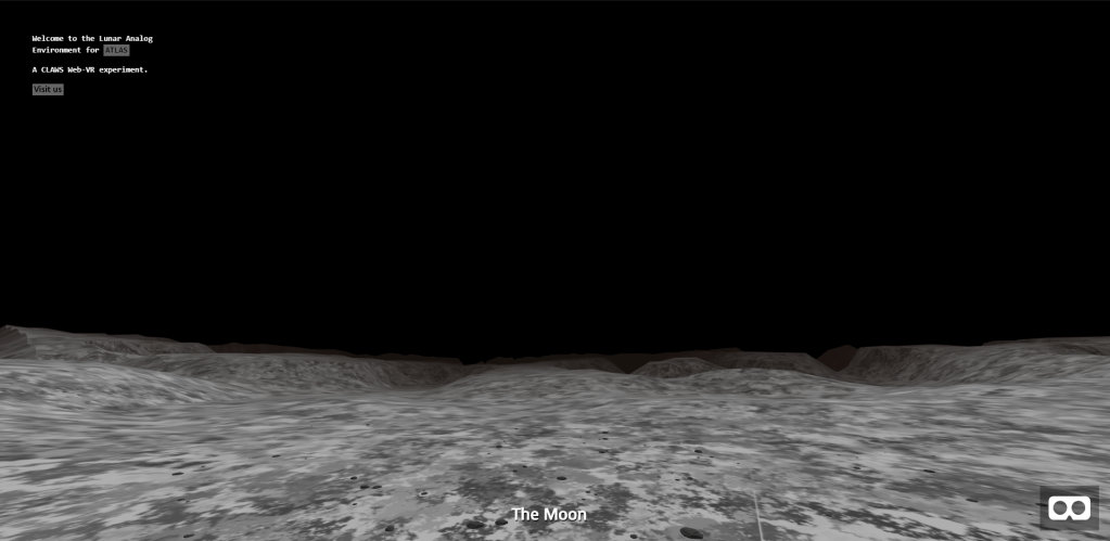 If nothing else, I want to be able to test with users through their own web browser. Ideally, they’ll be able to share their screen so I can see what they’re looking at, and their webcam so I can see their expression while they’re looking at it. While it’s not the same as actually being on the surface of the Moon, creating analog environments for simulating habitat design are relatively common at NASA (Stuster, 1996; Clancey, 2004; see also: NEEMO and BASALT). A WebVR environment as a lunar analog in which to test AR concepts follows this approach.