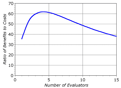 Depending on your particular circumstances and the given experience of the evaluators you have at your disposal, it may be possible to produce significant findings from a single evaluator. However, there are a few reasons for having multiple evaluators. Nielsen found through his own research on the method that single evaluators will only uncover about 35% of the issues present in the system (Nielsen, 1994). Furthermore, different evaluators tend to find different problems. From the curve shown below, Nielsen demonstrates that the optimal number of evaluators is 3–5. While you may uncover some additional issues by adding more than 5 evaluators, depending on how critical and complex the system to be evaluated is, there is a greater likelihood of overlapping issues found with that of other evaluators. In other words, there are diminishing returns in a cost-benefit analysis as shown below.