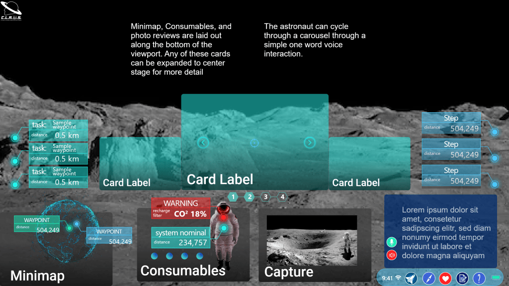 I led the UX Research, rapid prototyping, and human-in-the-loop testing for an augmented reality information system designed for use in the Artemis generation xEMU spacesuit during lunar EVAs, as well as VEGA (Voice Entity for Guiding Astronauts) a Rasa-based conversational AI.
